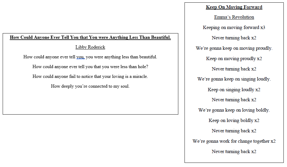 The lyrics to Libbey Rodderick's How Could Anyone Ever Tell you that You Were Anything Less than Beautiful and Keep On Moving Forward by Emma's Revolution. Both songs were sung by the group visiting the cemetery during the final site visit