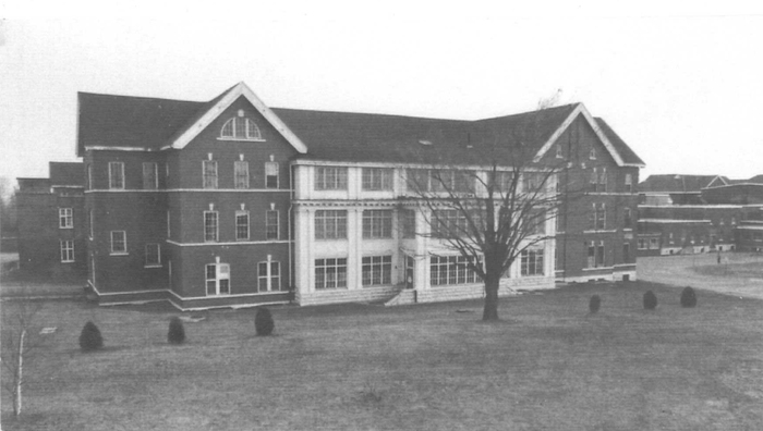 A black and white photograph of a large brick building with white window sills. The entire building is visible with pavement in the foreground and more architecture behind the main building. Bars cross the windows.